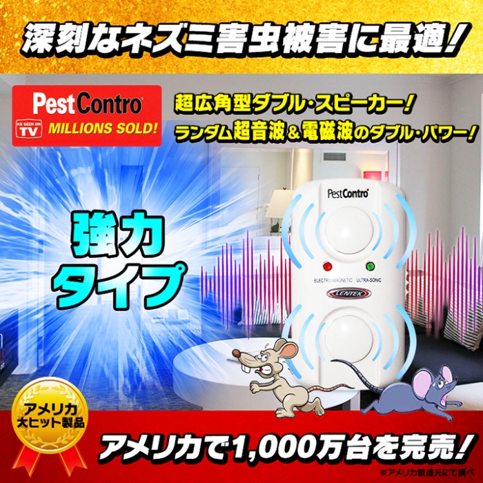 ☆『ペストコントロ(R)』は、アメリカなどでテレビ放映されている【アメリカ大ヒット製品】で、アメリカを中心に【1,000万台完売の確かな実績】のある、【全自動の】(ランダム変動の)超音波&電磁波のダブル・パワーによる、ネズミ害虫駆除器の決定版です! ☆弊社は、『ペストコントロ(R)』の日本における『(単独)正規総輸入元』です。 スウィープ・サウンド・テクノロジー! アメリカ大ヒット技術「スウィープ・サウンド・テクノロジー」による最新のネズミ害虫の駆除方法で、本機器「新型デジタル・ペストコントロ(強力タイプ)(PC12C)」は、(スマホ程度の大きさの)コンパクトな機器を【コンセントに差し込むだけ】で、後は全て【全自動】で、25,000〜100,000ヘルツの忌避周波数の超音波が波を打ったように上下に大きく波長をアトランダムに変動させ(ランダム変動超音波)、また、同時に【全自動】で、コンセントから電磁波が、壁の中の屋内電気配線をずーーと伝わり、(壁の中に)「電磁界」を作って、天井裏/屋根裏にまで到達するので、壁の中や天井裏・屋根裏に潜むネズミ害虫が慣れることも非常に考えにくく、ネズミ害虫に極めて大きな不快感を継続的に与え、徐々にジワジワと追い詰め、家屋からネズミ害虫を自然と追い出すことが可能です。