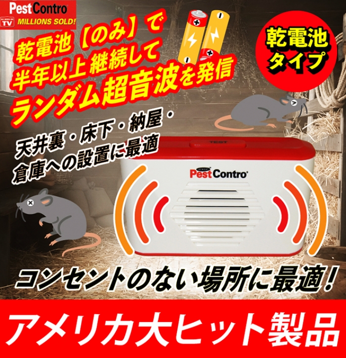 ■■■お客様からの実際の使用報告例■■■ (1)小さな飲食店(バー/スナック)を経営しているので、Newペストコントロを数年愛用しています。しかし、お客様の手前、延長コードを使って屋根裏に設置することも難しいので、厨房などに見えないように設置していました。乾電池式のポータブルのペストコントロが新発売になったので、早速購入して、乾電池で天井裏に設置しました。おかげでとても助かっています。(大阪府・男性) (2)ネズミ駆除業者に依頼したこともありましたが、なかなか持続性がなく困っていました。そんなときに偶然出会ったのがNewペストコントロでした。2台を設置して既に3ヶ月くらいになりますが、お陰様で全くと言っていいほど見なくなりました。Newペストコントロを買ったのは、元々ネズミを駆除するのが目的でしたが、Newペストコントロは、台所や食卓によく出るその他の害虫などにも大きな効果があるということがわかったので、追加で買って台所や食卓のコンセントにも付けています。(東京都・男性) (3)年頃の娘がネズミ駆除業者さんたちを部屋に入れるのをとても嫌がり、何か良い方法はないものか、と思案していたところでした。初めは半信半疑でしたが、Newペストコントロを設置したところ、運動会のようにうるさかった天井裏が静かになりビックリしています!(神奈川県・女性) (4)今までは市販のバルサンやホウ酸団子のような殺鼠剤を使っていましたが、煙を吸い込んで体にも悪く、また何よりも死骸の処理をするのが嫌でした。このペストコントロは、そんな処理の心配がないので非常に助かっています。(福岡県・女性) (5)以前、アマゾン/楽天で買った「中国業者」が出品していた「3個900円」の超音波ネズミ害虫駆除器は、まさに「おもちゃレベルの粗悪なまがい品」そのもので、アメリカ仕様そのままの120Vの電圧のもので、電気用品安全法違反の製品でした。こちらのネット・ショップは、正規総輸入元だけあって、日本仕様の100Vの電圧で、日本の電気用品安全法の合格証の「PSE適合マーク付き」の製品なので安全かつ安心だし、正規総輸入元だけあって、高品質なので満足しています。(東京都・女性)