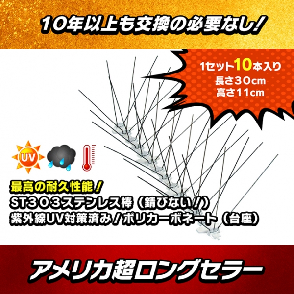 ■サイズ(1本につき):最大横幅12.7cm,高さ10.9cm,幅(台座部分)1.3cm■重量(1本につき):約136g ■本数:10本入り(1本の長さ:約30cm) ■素材:【頑丈かつ耐久性バツグン!】ST302ステンレス・スチール(スパイク部分)、【紫外線UV対策済み!】ポリカーボネート(台座部分) ■防除対象:ハト(鳩)、カラス、カモメ、ムクドリ・ヒヨドリ、などの鳥類(およびそれ以上の大きさの鳥類)、コウモリ(※および鹿、猿、イノシシなどの大型動物、野良猫・イタチ・ハクビシン・タヌキ・アライグマ・きつね・テン対策などにも応用可能)。