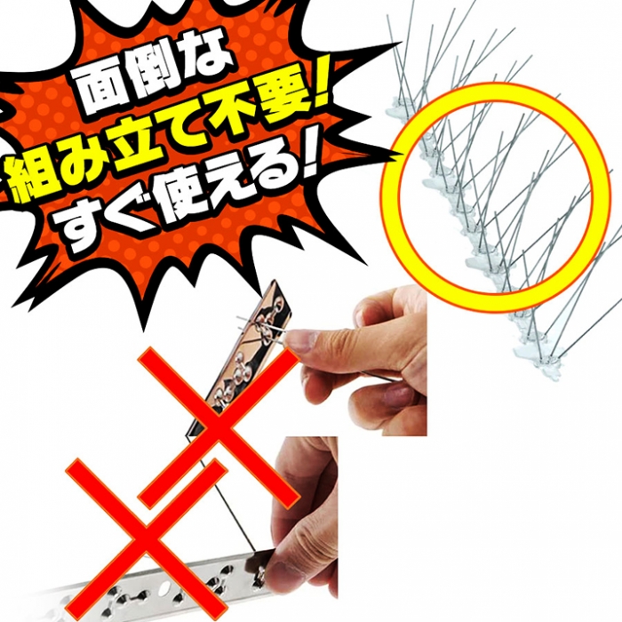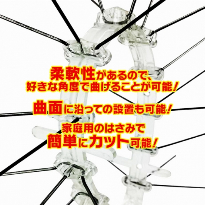 ステンレス製で、サビや腐食に極めて強く、長持ち! 耐食性に優れた302ステンレス棒と、耐久性が高く紫外線に強いポリカーボネート(紫外線UV対策済み)の台座でできています。 ※競合他社のプラスチックやポリエチレン製と違い、耐久性に極めて優れており、強度もあるので高い効果を期待できます。 鳥などを傷付けずに寄せ付けなくして、害鳥対策! 建物外壁の凹凸部分、窓枠、屋上、街路灯、看板、バルコニー、ベランダ、手すり、エアコン室外機、軒・庇・雨樋、駐車場、倉庫、工場等、様々な場所に簡単設置! ジェル剤のように建物や壁を汚すことがありません。 単体あるいは組み合わせで、自由自在・簡単に設置可能! 柔軟性があるので、任意の角度で曲げられます。また、曲面に沿っての設置も可能です。(家庭用のはさみで簡単にカットできます。) シリコン接着剤(市販の工事用や屋外用など)、ワイヤー(針金)、ビス・釘・ネジなど、設置面に合わせた多様な方法で、簡単に設置が可能です。