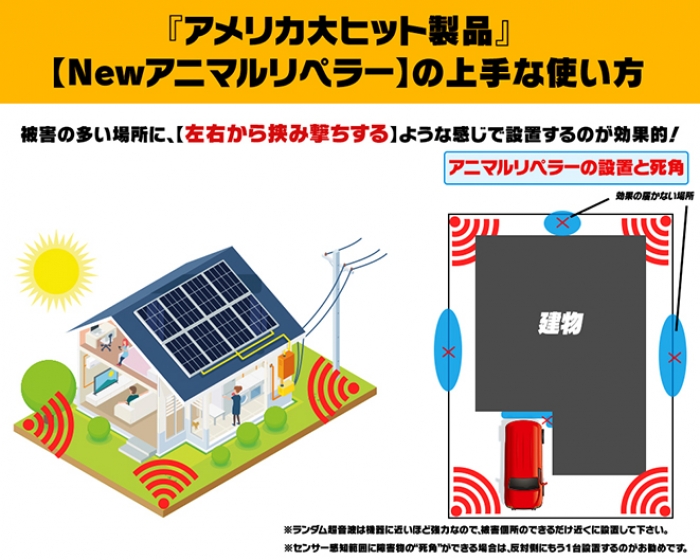 ☆☆アメリカ主要紙にも、たいへん好意的に掲載されました!☆☆(※掲載されたのは、強力ハイグレード・タイプ(RC132)です。) ■「作動時間帯切り替えスイッチ」が便利 「作動時間帯切り替えスイッチ」により、「夜間のみ」「昼間のみ」作動させることも可能。なので、夜行性動物にもピンポイントで対応。(もちろん、24時間作動させることも可能。) ■安全性その他 本製品は、アメリカで数多くの実験を繰り返し開発され、販売に至った製品で、アメリカなど海外市場でその効果の有効性から大きな信頼を得ています。 発信される音波・超音波は、人間には全く影響を与えない波長で安全です。周辺のコンピュータ類、電気製品や電話器等にもまったく影響はありません。 (※また、【防水タイプ=防水性能:IP44】ですので、通常の雨は問題ありません。また、【レイン・ジャケット付き】なので、大雨時にも安心!)。 ■注意事項その他 ※超音波照射・ストロボ発光にとって死角となる場所には、もう1台、Newアニマルリペラーを設置し、できれば、【左右から挟み撃ち】するような感じでお使いいただくことをお勧め致します。 ※本機器は、3大機能により、ジワジワと徐々に害獣・害鳥を駆除する製品ですので、野良猫・イタチ・カラス(あるいはハト・タヌキ・ハクビシン・アライグマ・アナグマ・リス・キツネ・コウモリ)等を寄せ付けなくするには、弊社「Newバード・スパイク」と同時併用されることもお勧めです。