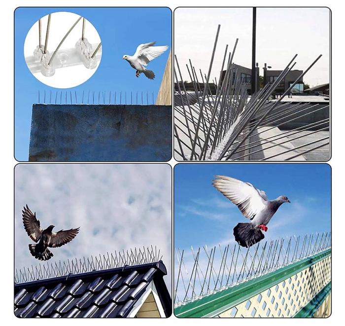 ステンレス製で、サビや腐食に極めて強く、長持ち! 耐食性に優れた302ステンレス棒と、耐久性が高く紫外線に強いポリカーボネート(紫外線UV対策済み)の台座でできています。 ※競合他社のプラスチックやポリエチレン製と違い、耐久性に極めて優れており、強度もあるので高い効果を期待できます。 鳥などを傷付けずに寄せ付けなくして、害鳥対策! 建物外壁の凹凸部分、窓枠、屋上、街路灯、看板、バルコニー、ベランダ、手すり、エアコン室外機、軒・庇・雨樋、駐車場、倉庫、工場等、様々な場所に簡単設置! ジェル剤のように建物や壁を汚すことがありません。 単体あるいは組み合わせで、自由自在・簡単に設置可能! 柔軟性があるので、任意の角度で曲げられます。また、曲面に沿っての設置も可能です。(家庭用のはさみで簡単にカットできます。) シリコン接着剤(市販の工事用や屋外用など)、ワイヤー(針金)、ビス・釘・ネジなど、設置面に合わせた多様な方法で、簡単に設置が可能です。
