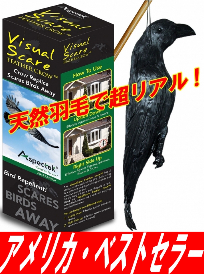 ※まっすぐに吊せば、「恐るべき獰猛な肉食系鳥である、生きたカラスがいる!」と見せかけることにより、鳩(ハト/はと)やムクドリ・ヒヨドリ、スズメ・ツバメ等の小さな鳥類に対して、危険シグナルを与え、その周辺に、鳩(ハト/はと)やムクドリ・ヒヨドリ、スズメ・ツバメ等の小さな鳥類を寄せ付けにくくします。