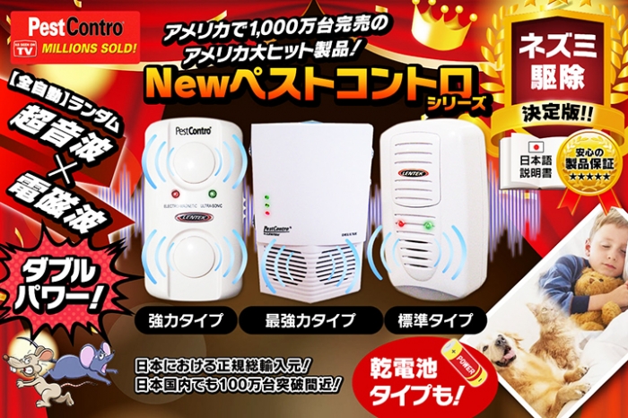 ■■■お客様からの実際の使用報告例■■■ (1)ネズミ駆除業者に依頼したこともありましたが、なかなか持続性がなく困っていました。そんなときに偶然出会ったのがNewペストコントロでした。2台を設置して既に3ヶ月くらいになりますが、お陰様で全くと言っていいほど見なくなりました。Newペストコントロを買ったのは、元々ネズミを駆除するのが目的でしたが、Newペストコントロは、台所や食卓によく出るその他の害虫などにも大きな効果があるということがわかったので、追加で買って台所や食卓のコンセントにも付けています。(東京都・男性) (2)年頃の娘がネズミ駆除業者さんたちを部屋に入れるのをとても嫌がり、何か良い方法はないものか、と思案していたところでした。初めは半信半疑でしたが、Newペストコントロを設置したところ、運動会のようにうるさかった天井裏が静かになりビックリしています!(神奈川県・女性) (3)今までは市販のバルサンやホウ酸団子のような殺鼠剤を使っていましたが、煙を吸い込んで体にも悪く、また何よりも死骸の処理をするのが嫌でした。このNewペストコントロは、そんな処理の心配がないので非常に助かっています。(福岡県・女性) (4)小さな飲食店(バー/スナック)を経営しているので、Newペストコントロを数年愛用しています。しかし、お客様の手前、延長コードを使って屋根裏に設置することも難しいので、厨房などに見えないように設置していました。乾電池タイプのポータブルのペストコントロが新発売になったので、早速購入して、乾電池で天井裏に設置しました。おかげでとても助かっています。(大阪府・男性) (5)以前、アマゾン/楽天で買った「中国業者」が出品していた「3個900円」の超音波ネズミ害虫駆除器は、まさに「おもちゃレベルの粗悪なコピーまがい品」そのもので、また、アメリカ仕様そのままの120Vの電圧のもので、電気用品安全法違反の製品でした。こちらのネット・ショップは、日本における正規総輸入元だけあって、日本仕様の100Vの電圧で、日本の電気用品安全法の合格証の「PSE適合マーク付き」の製品なので安全かつ安心だし、正規総輸入元だけあって、高品質ので満足しています。(東京都・女性)