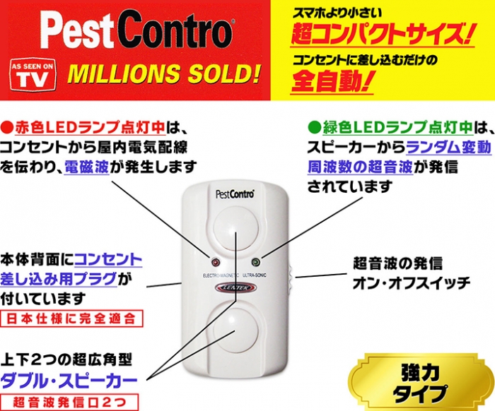 ☆『ペストコントロ(R)』は、アメリカなどでテレビ放映されている【アメリカ大ヒット製品】で、アメリカを中心に【1,000万台完売の確かな実績】のある、【全自動の】(ランダム変動の)超音波&電磁波のダブル・パワーによる、ネズミ害虫駆除器の決定版です! ☆弊社は、『ペストコントロ(R)』の日本における『(単独)正規総輸入元』です。 スウィープ・サウンド・テクノロジー! アメリカ大ヒット技術「スウィープ・サウンド・テクノロジー」による最新のネズミ害虫の駆除方法で、本機器「新型デジタル・ペストコントロ(強力タイプ)(PC12C)」は、(スマホ程度の大きさの)コンパクトな機器を【コンセントに差し込むだけ】で、後は全て【全自動】で、25,000〜100,000ヘルツの忌避周波数の超音波が波を打ったように上下に大きく波長をアトランダムに変動させ(ランダム変動超音波)、また、同時に【全自動】で、コンセントから電磁波が、壁の中の屋内電気配線をずーーと伝わり、(壁の中に)「電磁界」を作って、天井裏/屋根裏にまで到達するので、壁の中や天井裏・屋根裏に潜むネズミ害虫が慣れることも非常に考えにくく、ネズミ害虫に極めて大きな不快感を継続的に与え、徐々にジワジワと追い詰め、家屋からネズミ害虫を自然と追い出すことが可能です。