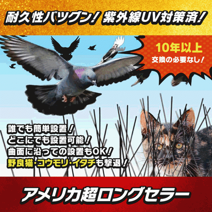 簡単設置で、鳩(ハト/はと)・カラス・ムクドリ・ヒヨドリ・ハクビシン・鼬(イタチ/いたち)・貂(テン)・アライグマ・タヌキ・きつね、コウモリ・ネコ対策! (アメリカで、鳩(ハト/はと)・カラス対策のロングセラーを独走中!また、ハクビシン・鼬(イタチ/いたち)・狸(タヌキ/たぬき)・アライグマ・きつね・貂(テン)、コウモリ、野良猫、鹿・猿などの対策にも、大好評!) ロッドが細く至近距離からでも目立ちにくく、アメリカでは、美術館や博物館などの歴史的建造物や鉄道駅等でも、広く使われています。 ※どの害鳥・害獣も、みな、Newバード・スパイクのような“物理的な障害物”を避け寄り付かなくなる『学習能力』を持っていますので、Newバード・スパイクは、害鳥・害獣の対策にたいへん効果的で優れています!