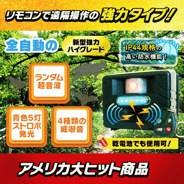☆Newアニマルリペラーの新型強力・上位機種、新規入荷! ■新型強力ハイグレード・タイプの特長 【ランダム変動超音波】【青色LED5灯ストロボ発光】【4種類の威嚇音(強弱は自由に調整可能)】の“3大機能”が標準搭載! 20メートル離れたところからでも、無料付属の小型リモコンで自由自在に遠隔操作が可能! (3大機能が1台に集約されたハイテク・モデル!) ■青色LED5灯ストロボ発光(3大機能の1つ) 青色LED5灯ストロボ発光により、特に、野良猫・イタチ・野ネズミ・鳥類・イノシシ・鹿・たぬき・ハクビシン・アライグマ・アナグマ・キョン・リス・キツネ・コウモリ等の夜行性動物の駆除に極めて有効。(野良猫・イタチ・イノシシ・鹿・鳥類・野ネズミ・たぬき・ハクビシン・アライグマ・アナグマ・キョン・リス・キツネ・コウモリ等の夜行性動物は、ストロボ発光のような光を極めて嫌います!) ※夜行性動物の駆除には、【青色LEDストロボが特に有効】であることが最近の研究結果により知られてきています! ■小型リモコン(無料付属)による遠隔操作 20メートル離れたところからでも、ほとんどの多彩な機能が自由自在に遠隔操作が可能。 ※内蔵電池(汎用乾電池)の寿命は、通常1年以上(約2千回のボタン押し使用が可能)。