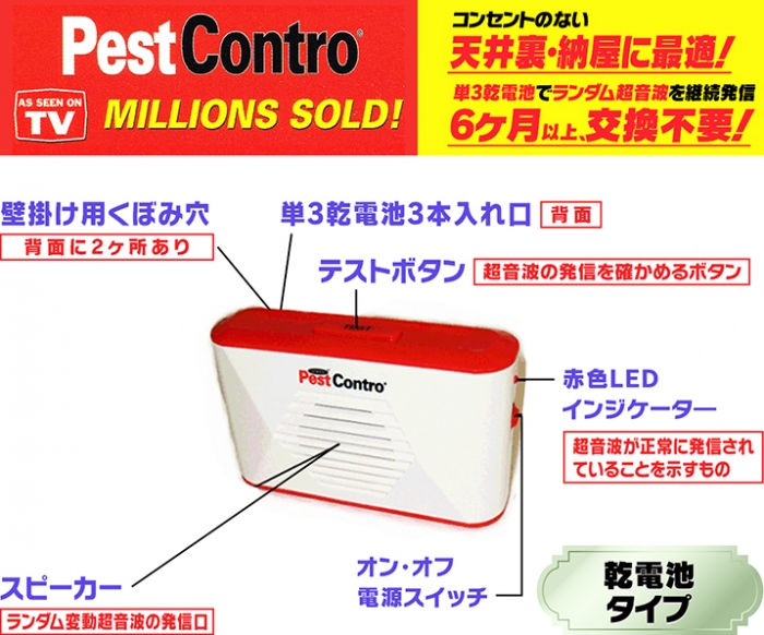ペストコントロ(R)は、アメリカなどでテレビ放映されているアメリカ大ヒット製品で、アメリカを中心に1,000万台完売の確かな実績のある、全自動の(ランダム変動の)超音波&電磁波のダブル・パワーによるネズミ害虫駆除器の決定版です!