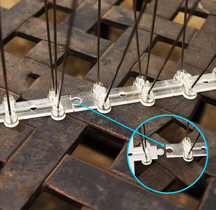 ステンレス製で、サビや腐食に極めて強く、長持ち! 耐食性に優れた302ステンレス棒と、耐久性が高く紫外線に強いポリカーボネート(紫外線UV対策済み)の台座でできています。 ※競合他社のプラスチックやポリエチレン製と違い、耐久性に極めて優れており、強度もあるので高い効果を期待できます。 鳥などを傷付けずに寄せ付けなくして、害鳥対策! 建物外壁の凹凸部分、窓枠、屋上、街路灯、看板、バルコニー、ベランダ、手すり、エアコン室外機、軒・庇・雨樋、駐車場、倉庫、工場等、様々な場所に簡単設置! ジェル剤のように建物や壁を汚すことがありません。 単体あるいは組み合わせで、自由自在・簡単に設置可能! 柔軟性があるので、任意の角度で曲げられます。また、曲面に沿っての設置も可能です。(家庭用のはさみで簡単にカットできます。) シリコン接着剤(市販の工事用や屋外用など)、ワイヤー(針金)、ビス・釘・ネジなど、設置面に合わせた多様な方法で、簡単に設置が可能です。