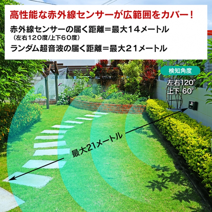 ■電源:ACアダプター(日本用100V無料付属;電気コードの長さ12メートル)または単2乾電池4本【乾電池のみでも使用可能!】(※正規総輸入元ゆえ、電圧・プラグ等は、日本仕様に完全適合(PSE合格マーク)) ■サイズ:横18cm,縦15cm,奥行10cm【場所を取らないコンパクト・サイズ!】 ■防水性能:『防水性能:IP44』【(高性能な)防水タイプゆえ雨天でも使用可!】 ■赤外線センサー感知範囲:最大14メートル(調整可能),左右120度/上下60度 ■ストロボ発光:30秒間に6回(「青色LED5灯ストロボ」搭載) ■超音波有効範囲:最大140坪(直線距離で最大21メートル) ■『作動時間帯切り替えスイッチ』あり:「夜間のみ」「昼間のみ」作動させることも可能(もちろん、24時間作動も可能)